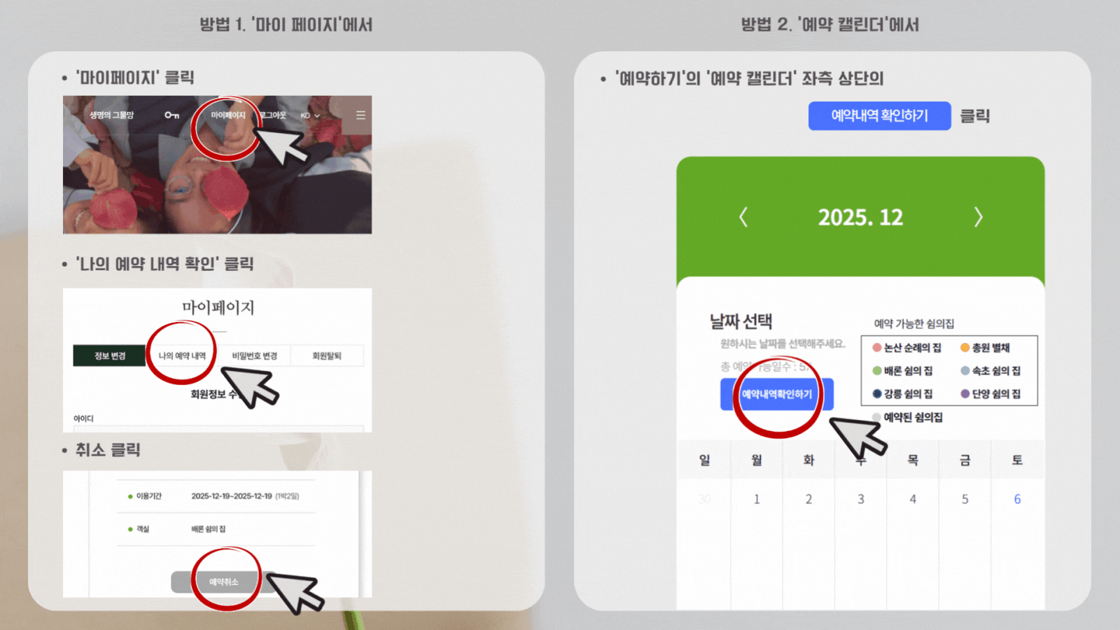 - 또는 예약하기 페이지의 [예약 캘린더] 좌측 상단의 [예약 내역 확인하기] 버튼 이용