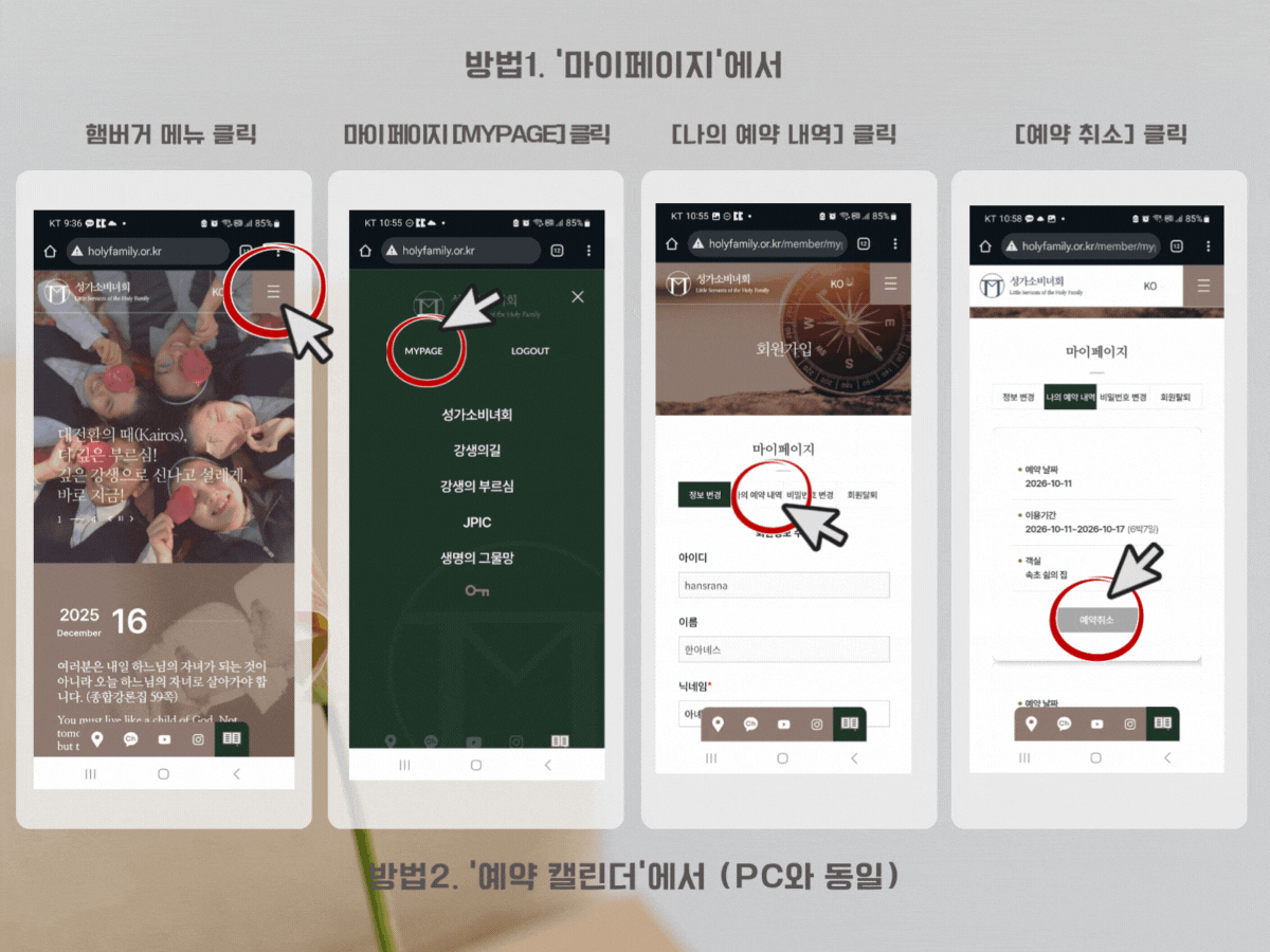 - 홈페이지 우측 상단 [마이페이지] → [나의 예약 내역]에서 확인 가능
